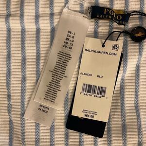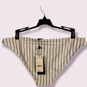 Womens size large white with blue stripes bikini bottom. Made of 75% polyester, 11% Elastane, and 14% Nylon. Bottom only.