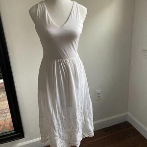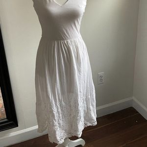 White Cottage Core Dress. 100% cotton flowy dress. There is a beautiful lace design on the bottom of the dress.