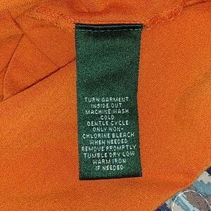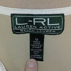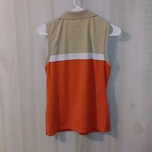 Pre-owned in fair condition Ralph Lauren Active sleeveless shirt. I say fair because it has 3 spots (see pics). Size is medium. Colors are tan, cream and orange. Measurements laying flat without stretching are: shoulder to shoulder 12", armpit to armpit 17" and total length 23".