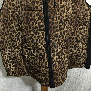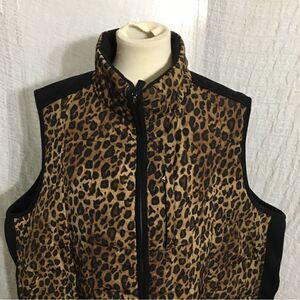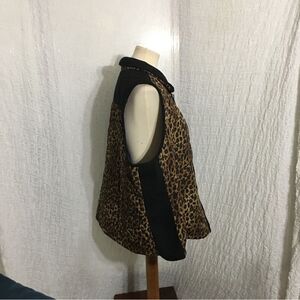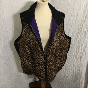 Animal print vest. High neck. Full Zipper closure. Front pockets. Pre-owned in good condition. No size available, best guess it's a size 2X. Please refer to pictures, and measurements for best description, condition verification, and fit.