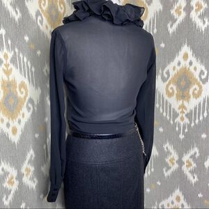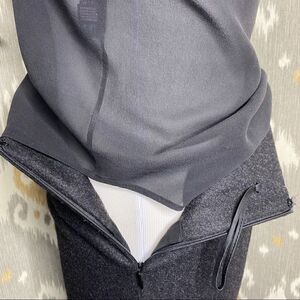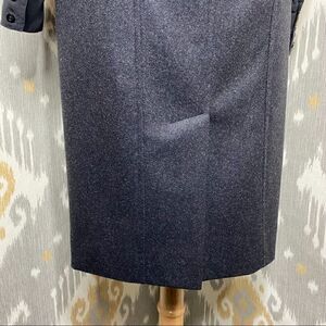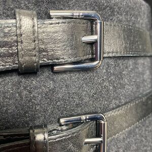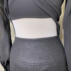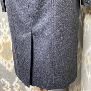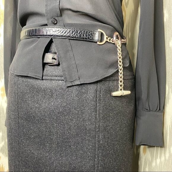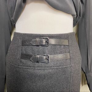 Chic charcoal grey flannel pencil skirt with black lamb leather double buckle detail. Wonderful paneled detail, with leather and silver accents. Wide drop waist, invisible zip, tailored shape, fully lined. Rich tone, in a buttery soft merino wool, angora, cashmere blend. The perfect office skirt, also perfect for special occasions. Love it with a crisp white blouse, cashmere cable sweater, or dressed down w/a faded denim shirt. Flat approx: waist 14”, hip 18.5”, length 24”. Lovely cond, see pics