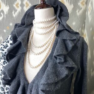 Luxe charcoal gray heather cashmere knit ruffle collar cardigan.