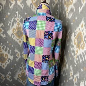 Eye-catching patchwork design of striped, checked, floral and paisley squares, signature embroidered player accents the left chest, shirttail hem, in easy care, washable cotton.