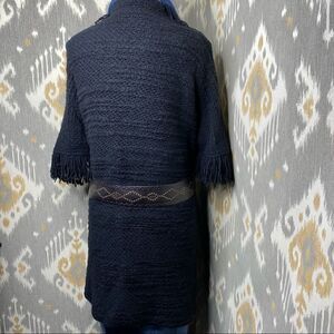 Open front v-neck style with a fringed edge, 3/4 fringed sleeves, and side on-seam hand pockets.