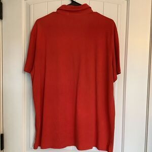 100% cotton, featherweight mesh, polo in reddish orange color. Navy icon. Spilt bottom hem for comfort. Size XL.