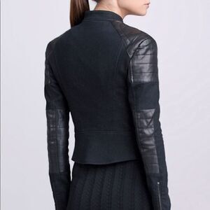 Understated and chic Made in Italy twilight stretch denim and lambskin leather moto jacket, with all the bells and whistles.