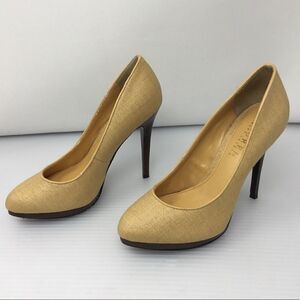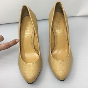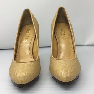 Lauren by Ralph Lauren “kailee” panama lacquered straw upper, faux wooden heels. Approx heel height 4”, platform .5”