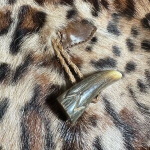 Beautiful bohemian animal print shearling fur vest, with carved double horn toggle closure, braided leather loops, 2 practical on seam hand pockets, flattering cutaway hem, and a luxurious full silk lining.