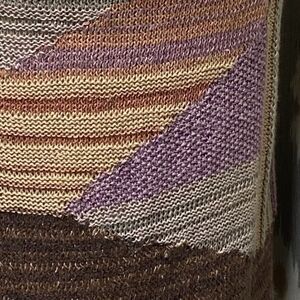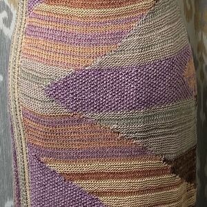 A soft painted desert-inspired palette of tan, brown, amethyst, orange, and pale sage green in subtly different intricately knit stitches.