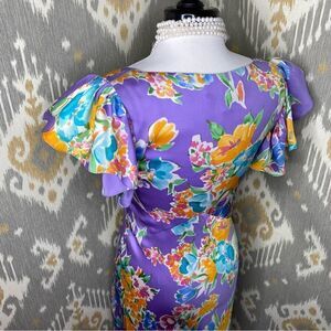 Made in Italy, Purple Watercolor Impressionist Floral Motif Silk Bias Cut Ruffle Sleeve Midi Dress.