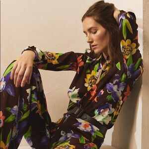This luxe Hailey floral print Cady blouse is beautifully printed in a Como, Italy, mill with a vibrant tropical flower motif, a vintage pattern pulled from the men’s purple label tie collection. Its Italian-made style is composed of luxe cady that produces a distinctive hand and a beautiful drape, finished with genuine mother-of-pearl buttons and a relaxed silhouette. It has a spread collar and long sleeves with buttoned cuffs. Crafted from an ultra-luxe, soft and comfortable viscose/silk/elastane stretch yarn, made in Italy. Dry clean only. Unworn, lovely condition, see pics.