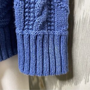 Beautiful nautical inspired intentionally faded and softened medium blue textural knit knit cardigan sweater with wooden toggle closure.