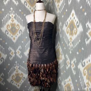 Vintage luxe chocolate brown silk taffeta strapless cocktail dress with horizontal ruching, and an exquisite 12-inch pheasant feather and beadwork hem panel.