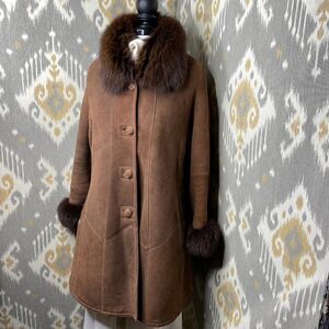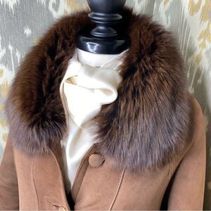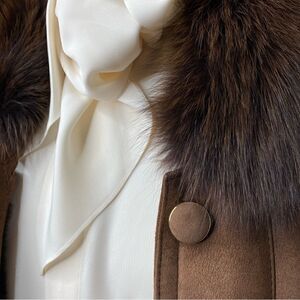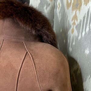 The deep brown supple suede, with the glorious fur trim, provides style, a lovely textural appeal, with a gorgeous hand.