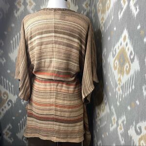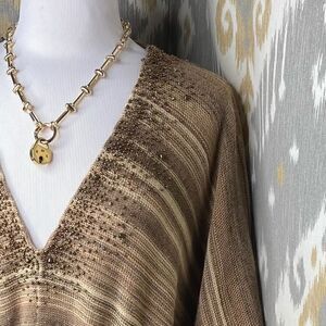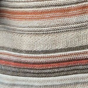Accented neckline decorated with bronze beadwork; knit in a rustic Sonora desert palette of rust, brown and cream horizontal stripes.