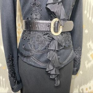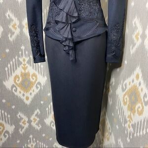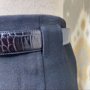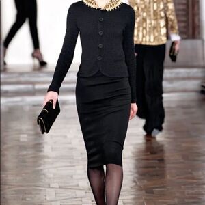 Vintage Collection black wool blend pencil skirt. High contoured waist, with tunneled belt loops, waist and hip darts, invisible rear zip, single rear vent, integrated shaping stretch, unlined, grosgrain interior detail. Flat approx: 25.5” length, 13” waist, 18.5” hips. Classic and chic, long and lean. Wonderful elevated basic building block for your designer wardrobe. Wear anywhere & everywhere, and with everything. Gently worn, lovely condition, see pics.