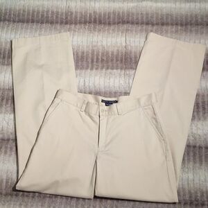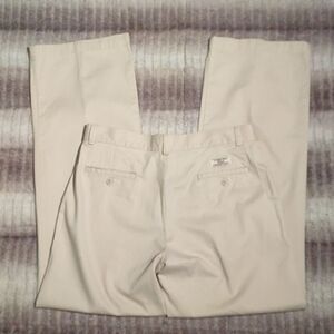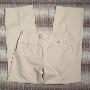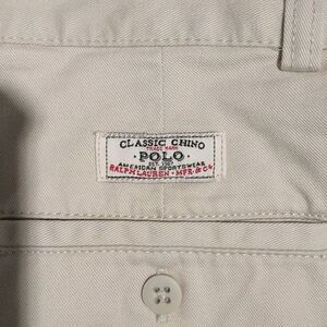 These cream colored Ralph Lauren Chino Polo slacks are a size 8. The waist measures 34", inseam = 32" with a front rise of 10". 100% cotton and machine washable. They have two front side pockets with two buttoned back pockets. Pre-owned and in excellent condition. All offers welcome.