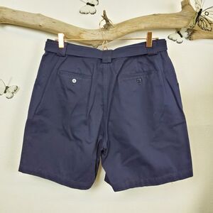 Navy blue belted twill shorts. Gold buckle detail. Generous thigh. 100% cotton. 80s 90s vintage style. adjustable belt attached
