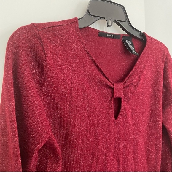 Deep red metallic shimmery sweater with 3/4 sleeve bell sleeves and folded square detail on keyhole v-neck neckline.