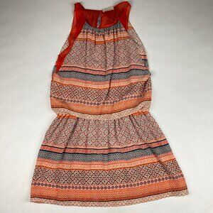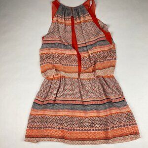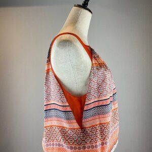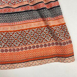 100% silk light weight dress features orange, black and white geometric pattern. Sheer sleeves/underarm/back layers. Elastic waistband.