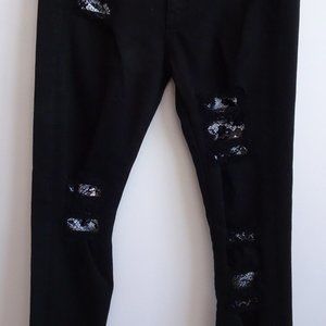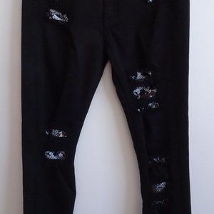 Ramy Brook Naomi Distressed Sequined Skinny Jeans in black with black and white sequin. Allover distressing details this mid-rise skinny denim pant. Gunmetal and white sequin patches under ripped areas. 98% cotton 2% PU