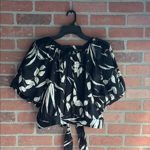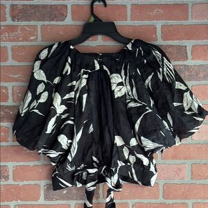 Stylish blouse with a bold leaf pattern. Features a tie detail for added flair. Ideal for versatile wear. Great condition! Everyday allure, this top is crafted from ancient ramie, a linen-like fiber renowned for its semi-sheer appearance and breezy feel against the skin. Designed to entice with an open back, bubble sleeves and a tie at back for an elevated silhouette.