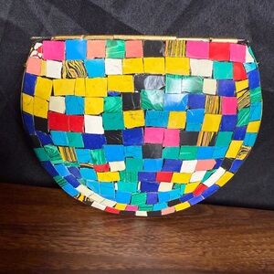 Handmade with beautiful craftsmanship, clutch with removable shoulder strap. Vibrant and unique, this colorful mosaic clutch is perfect for adding a pop of color to any outfit. Featuring a stunning array of colors, it's a standout accessory for any occasion.