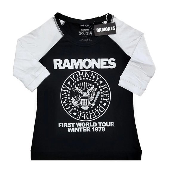 This black and white Raglan Tee from Ramones features Ramones First World Tour 1978 Seal Logo design on the front. 100% soft style cotton. Listed in junior size range. Check measurements.