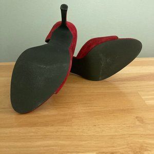 Theses peep-toe heels are a deep red suede. Very little wear. They look great with that little black dress!