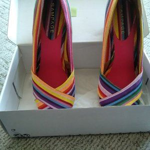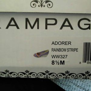 NEW IN BOX Rampage "Adorer" Bright Rainbow Striped woven fabric Heeled Wedges