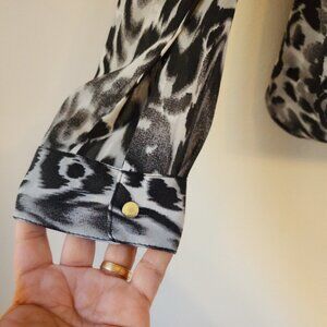 Add a touch of elegance and edge to your wardrobe with this Rampage animal print blouse. The classic camisole style features a round neckline, button and pullover closure, and long tab sleeves with a button closure. The double wrap front and back and key hole on the back add unique accents to this chic piece. Perfect for any occasion, whether it's a casual day out or a formal event, this blouse is made from semi-sheere polyester fabric that is easy to care for. The black and grayish color combination adds a retro look to this modern piece. Embrace the feminine and preppy style with a touch of vintage inspiration. Available in women's size M, this blouse is a must-have addition to any fashion-forward wardrobe. In Excellent Pre-Owned Condition. There are 1 thread pull see picture 4.