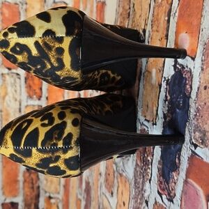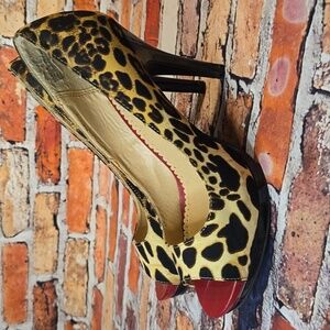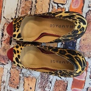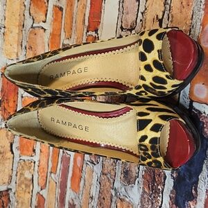 Rampage Cheeta print / black / red stiletto heels . Open toe. 4.5 " heels Man made materials. Size 8M