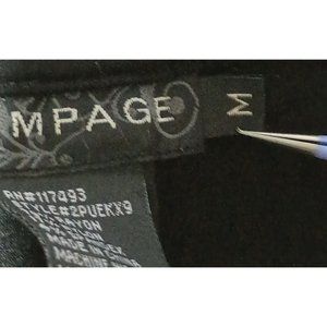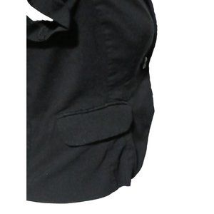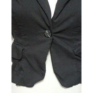 Other: Stretchy, tight fitting so can most likely fit smaller sizes, ruched short sleeves that are almost cap sleeves, one button closure, collared, single breasted, front pockets that are still stitched closed, fitted, black