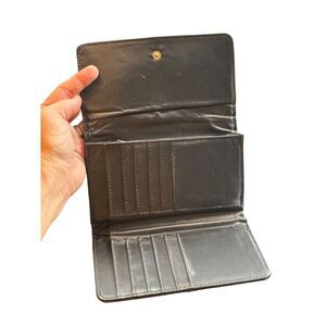 Stylish and functional Rampage wallet featuring gold zippers and snap closure. Multiple card slots and compartments for organized storage.