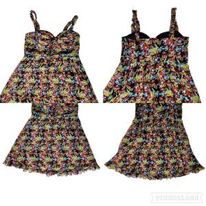 Brand: Rampage. Occasion: Casual, Day Out, Festival. Size Type: Regular. Size (Juniors): 9. Material: 100% Polyester (Shell). 95% Polyester, 5% Spandex (Lining). Neckline: Sweetheart, Ruched. Style: Babydoll, Mini, Y2K, Fairycore, Cottagecore, Boho, Feminine. Sleeve Length: Sleeveless. Color: Multicolor, Black, Yellow, Pink, Blue. Pattern: Floral. Features: Ruched bodice, side zip closure, hook and eye closure, ruffled hemline, lined.