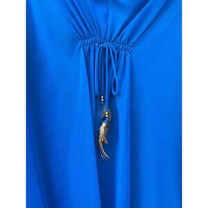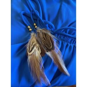 Absolutely gorgeous top by Rampage. A sheer royal blue covers a stretchy blue liner. Cinched in the chest area and adorned with a couple of feathers gives off a Bohemian feel. Beautiful to wear with dress pants or skirt or pair of jeans depending on the occasion. As I was folding I did notice a couple of very small hiccups, possible snags, near the very bottom in the back. I didn’t notice until I was folding. It was just dry cleaned.