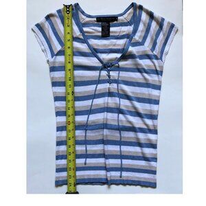 Rampage, Blue, White & Tan Stripe, stretchy, short/cap sleeve, top, with tie-up at bustline, Size Medium