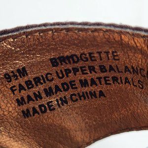 Brown fabric upper with adjustable ankle strap and gold buckle.