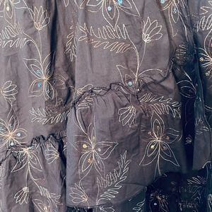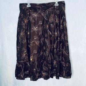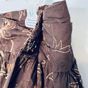 Ramage wrap skirt. Two hooks on the side. Tiered bottom. Embroidered with sequins throughout. 99% cotton, 1% spandex. Machine washable. Juniors size 11.