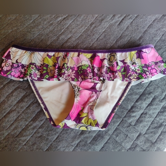 Floral Rampage bikini bottom with ruffle top and purple velvet accent!