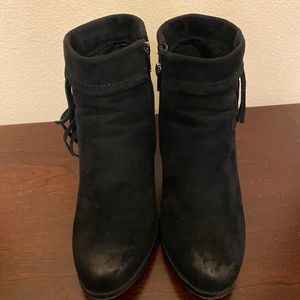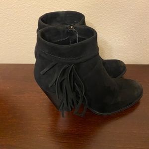 Cute faux suede ankle booties with fringe on the sides and a slight distressed look on the front of the shoe.