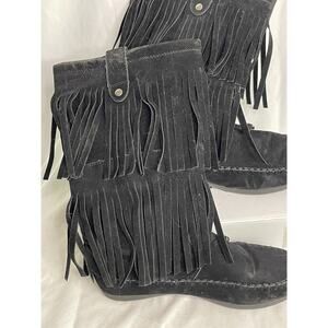 Rampage Ram-Cammy 2-layer fringe boot in black faux suede. Women’s size 8M. Mid-calf with round toe. Bohemian moccasin hippie western style. Maybe worn once or twice. Great condition. Must have for the boho hippie or western closet or heading to a festival, concert or rodeo!