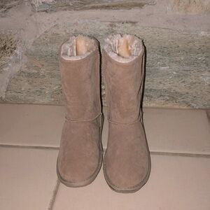Suede look outer with sweater material and buckles in the back. Fur lined inside