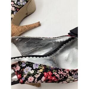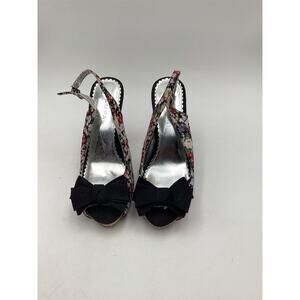 Keywords: Rampage, slingback heels, multicolor, floral pattern, peep toe, high heel, party shoes, cocktail shoes, spring fashion, women's shoes, synthetic material, adjustable buckle, black bow, pre-owned heels, size 9.