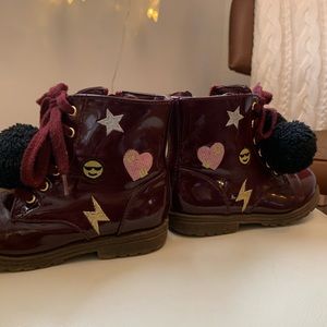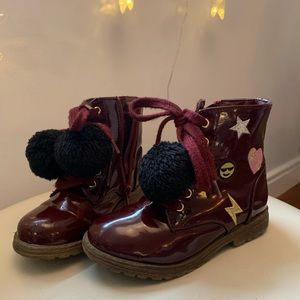 Loved these cute patent (shiny) combat style boots for toddler girls. The inseam zipper makes getting these on a breeze for a toddler. These boots are perfect for fall, this burgundy color goes well with all the fall colors. My little one loved the black Pom poms and the stitched patches on each shoe. These still have tons of life left and have maintained their shape well. Great tread! There are a few very small scratches on the toes, (as seen in pics) not noticeable when on.