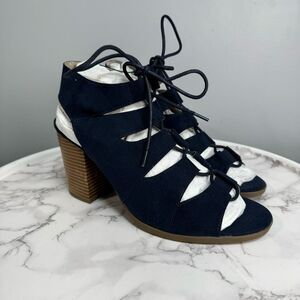 Black heel ghillie sandal with adjustable lace.
