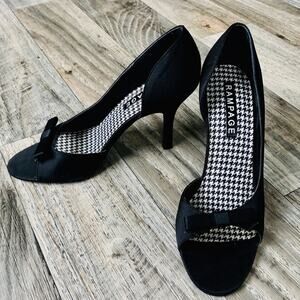 Rampage Jackie O. Black Satin Open Toe Heels. Size 8. Super cute bow detail. 3' heel. In excellent condition. No flaws.