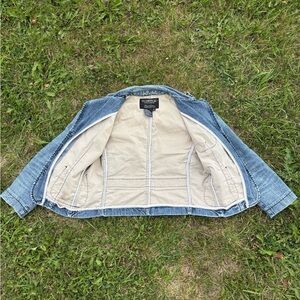 See photos for condition. Stain on right pocket, hole on right sleeve.