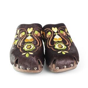 Brand: Rampage Keith Vintage Y2K Pony Hair Floral Print Wooden Sole Clogs