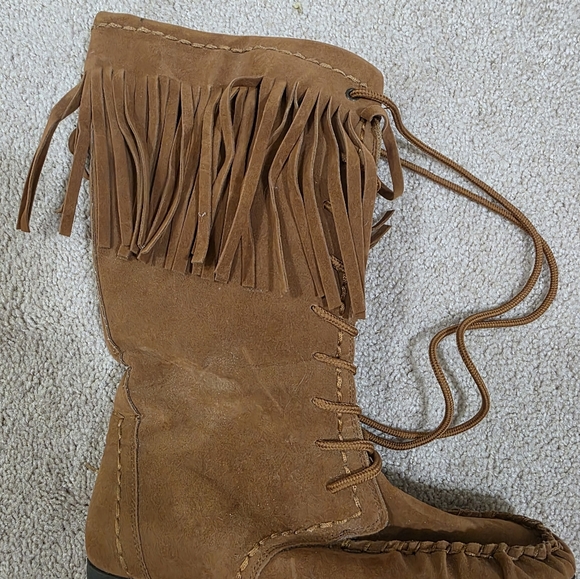 Stylish lace-up boots with fringe detail. Perfect for a boho look. Comfortable and trendy.